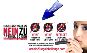 Bitte unterstütze Totally Wicked, und verleihe der Anfechtungsklage vor dem EUGH durch Deine Stimme weiteres Gewicht! Totally Wicked wird die Anzahl der erfolgten Unterstützungsbekundungen dieser Kampagne als weitere Argumentationshilfe geltend machen können. Bitte teilen diesen Link, und mache darauf aufmerksam, dass für die Zukunft des Dampfens in Europa mehr als nur die Stimme oder das Engagement des Einzelnen zählt. http://article20legalchallenge.com/ (englisch)