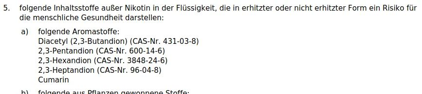 Jetzt muss man noch speziell den Punkt Diacetyl hervorheben: Popcorn Lunge blabla… dazu kennen wir die Details genug, aber: Hat denn dieser Händler und Hersteller immer noch nicht mitbekommen: Diacetyl steht in der Tabakerzeugnisvordnung (TabakerzV) in Paragragraph 28 Anlage 2 und ist somit verboten. Diacetyl ist auch in „geringen Mengen“ verboten.