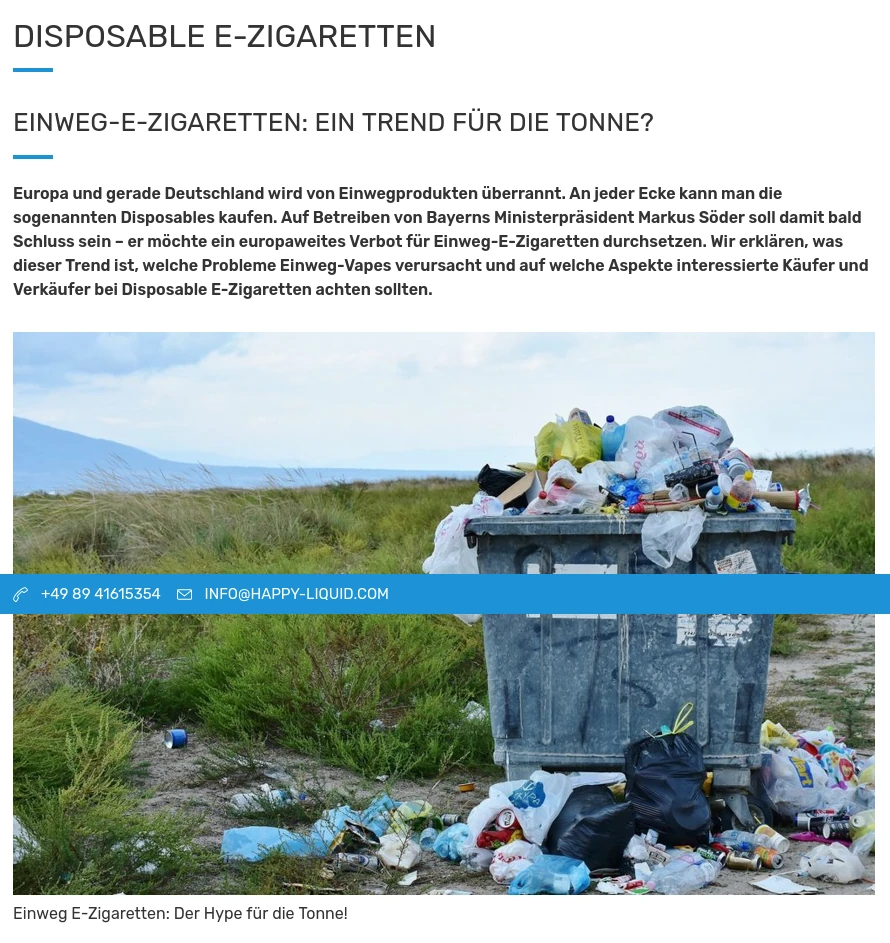 Simon Bauer (Vorstand Bundesverband rauchfreier Alternativen e.V.) vertrat eine kritische Auffassung zum Thema Einweg E-Zigaretten. Gleichzeitig gab er auch als Statement ab, der E-Zigaretten Fachhandel wäre bezüglich Einweg E-Zigaretten „zu 100% sauber“. Ursprung dieser Feststellung (Marktanalyse, Studien) wurden nicht benannt. Diese Meinung wurde nicht belegt. Ihr wurde auch nicht von den Vertretern des Bündnisses für tabakfreien Genusses (BfTG) oder des Verbandes für E-Zigarettenhandel widersprochen oder mit Fakten angereichert. Diese Meinung wird ganz offensichtlich von Tom Mrva zumindest auch so vertreten. So heißt es auf der Homepage von Happy Liquids: