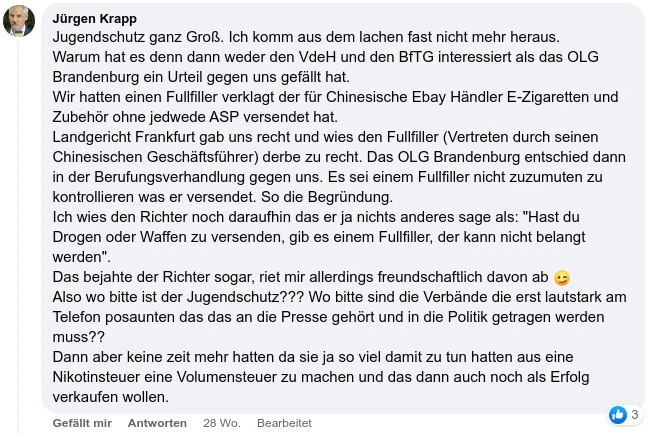 Das Statement des VdeH wie wichtig dem Verband und dessen Mitgliedern der Jugendschutz ist, wird von einem ehemaligen Händlermitglied (Lassdampfab, Jürgen Krapp) mit dem einen Kommentar vom 15.09.22 sprichwörtlich öffentlich aus den eigenen Reihen zerlegt.
