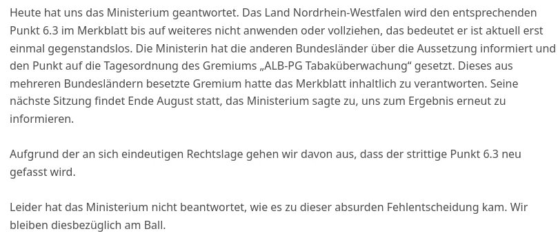 Nun hat das Ministerium für Landwirtschaft und Verbraucherschutz des Landes Nordrhein-Westfalen reagiert (arch) und mitgeteilt, dass besagter Punkt des Merkblatts vorerst nicht „vollstreckt“ werde. Der Punkt werde auf der nächsten Sitzung des ALB-PG Tabaküberwachung (dieses Gremium zeichnet für das Merkblatt verantwortlich… das auch in Bayern und etlichen anderen Bundesländern im Umlauf ist) besprochen und erörtert.