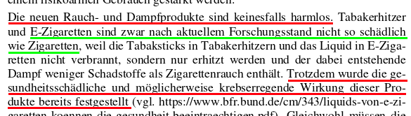 Sie begründen das mit einer herbeifantasierten Gefährdung der Jugend, die ja dem Dampfen verfallen ist und mit einer behaupteten Gesundheitsschädlichkeit, die sie einer vollkommen veralteten Stellungnahme des BfR (2012/2013… ist ja nur um die acht Jahre alt und würde selbst vom BfR heute nicht mehr so formuliert werden) [2] entnommen haben. Sie faseln davon, dass E-Dampfen zu Gesundheitsschäden führen kann… woher sie dieses Wissen haben, bleibt ein Geheimnis… ist also auch ein „Geheimwissen“… und philosophieren über das ach so abhängig machende Nikotin.
