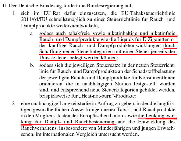 Konkret fordern sie eine zusätzliche Steuer für E-Dampf-Produkte… AUCH für nikotinfreie übrigens… und zwar als LENKUNGSSTEUER.