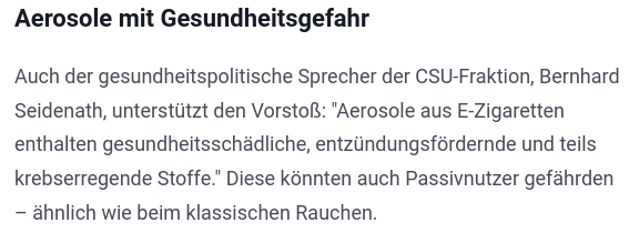 So kann man bei München.T-Online lesen: „Krebserregende Stoffe“ – CSU will Konsum von E-Zigaretten in Bayern stärker regulieren