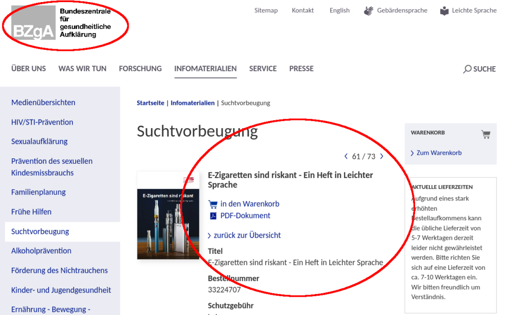 So ist der Verweis auf die BZgA geblieben. Der Unterschied zur DHS ist in Bezug auf das E-Dampfen aber zu vernachlässigen. Sie bieten z.B. auch das o.g. „DHS-Heft“ an… als Druckversion oder zum Kostenlosen Download.