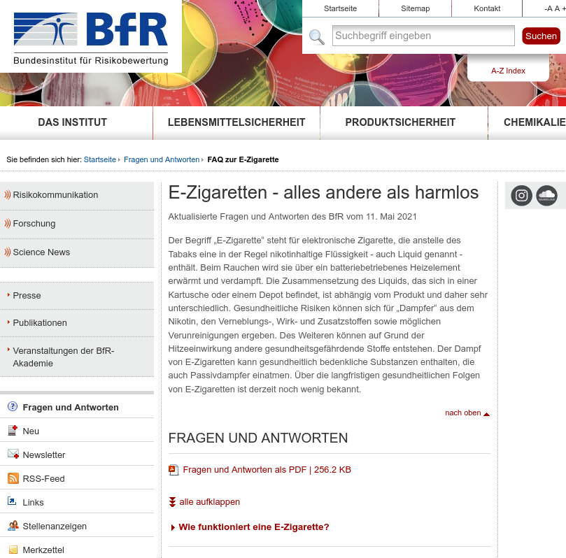 „Neben Nikotin können auch andere Inhaltsstoffe der Liquids sowie mögliche Verunreinigungen zu gesundheitlichen Gefährdungen führen.“