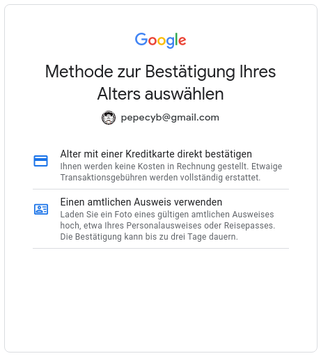 Hmmm… na dann schauen wir mal, wie wir denn beweisen können, dass wir schon in den Puff dürfen. Google ist da ganz großzügig und bietet mir zwei Varianten an: entweder, ich mache das mit meiner Kreditkarte (ohne was zu bezahlen) oder ich lade ein Foto von meinem Personalausweis hoch… dann kann es aber länger dauern.